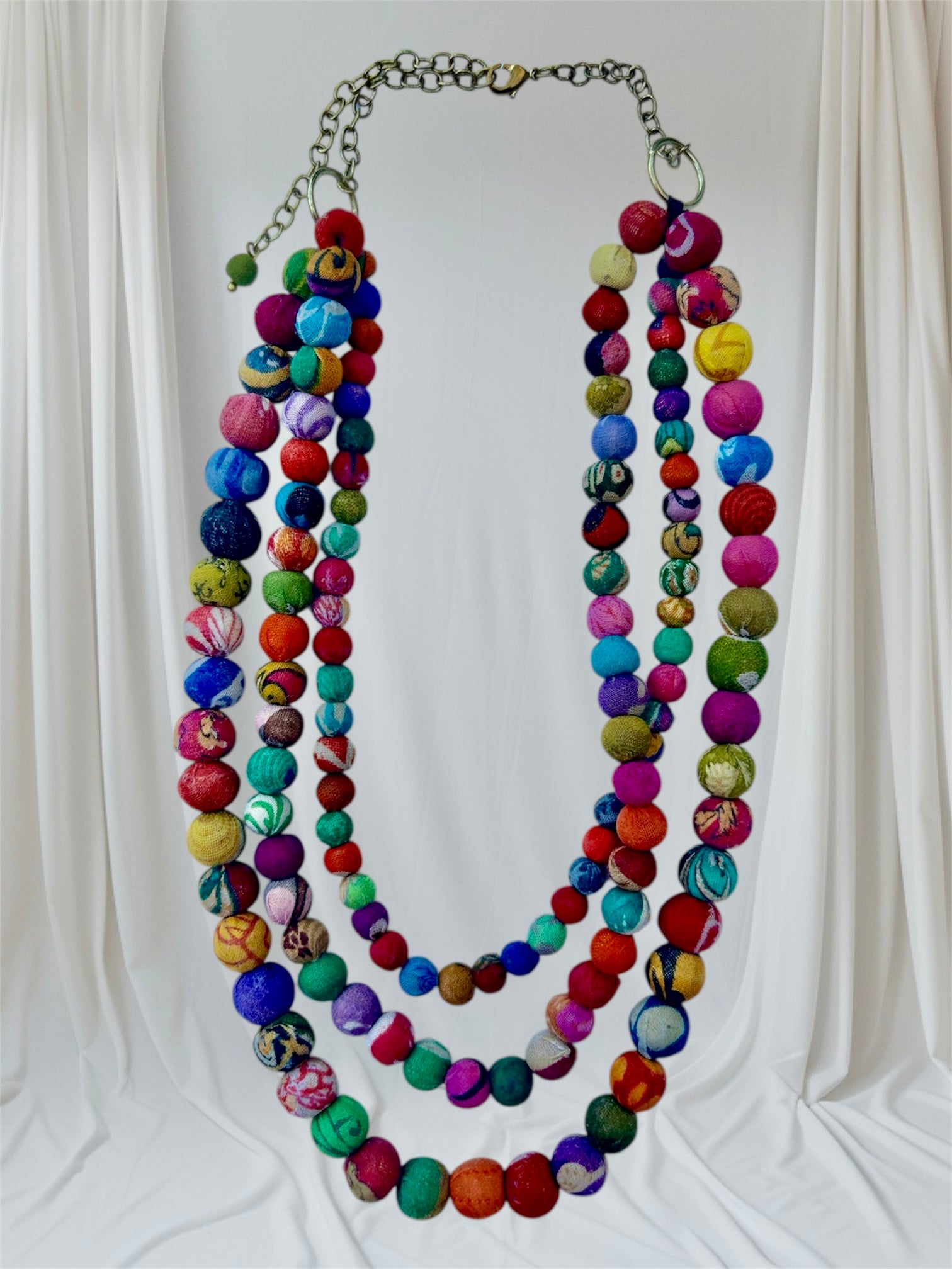This necklace has been made from repurposed wood beads covered in recycled sari.